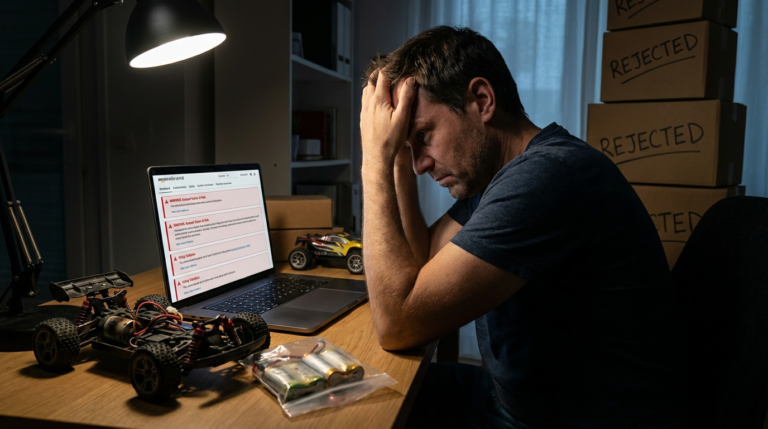 Lorsque les marchandises sont arrivées à l'entrepôt Amazon FBA, le taux de rejet était 34%. Les moteurs ont grillé après 10 minutes. Les piles ont coulé. Pire encore : les produits n'avaient pas de certification CE pour ses listes européennes. Amazon a suspendu trois de ses ASIN au cours de la première semaine.