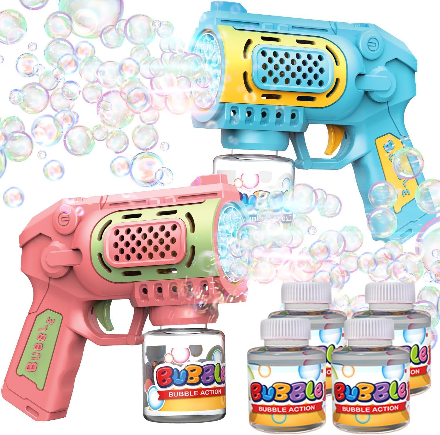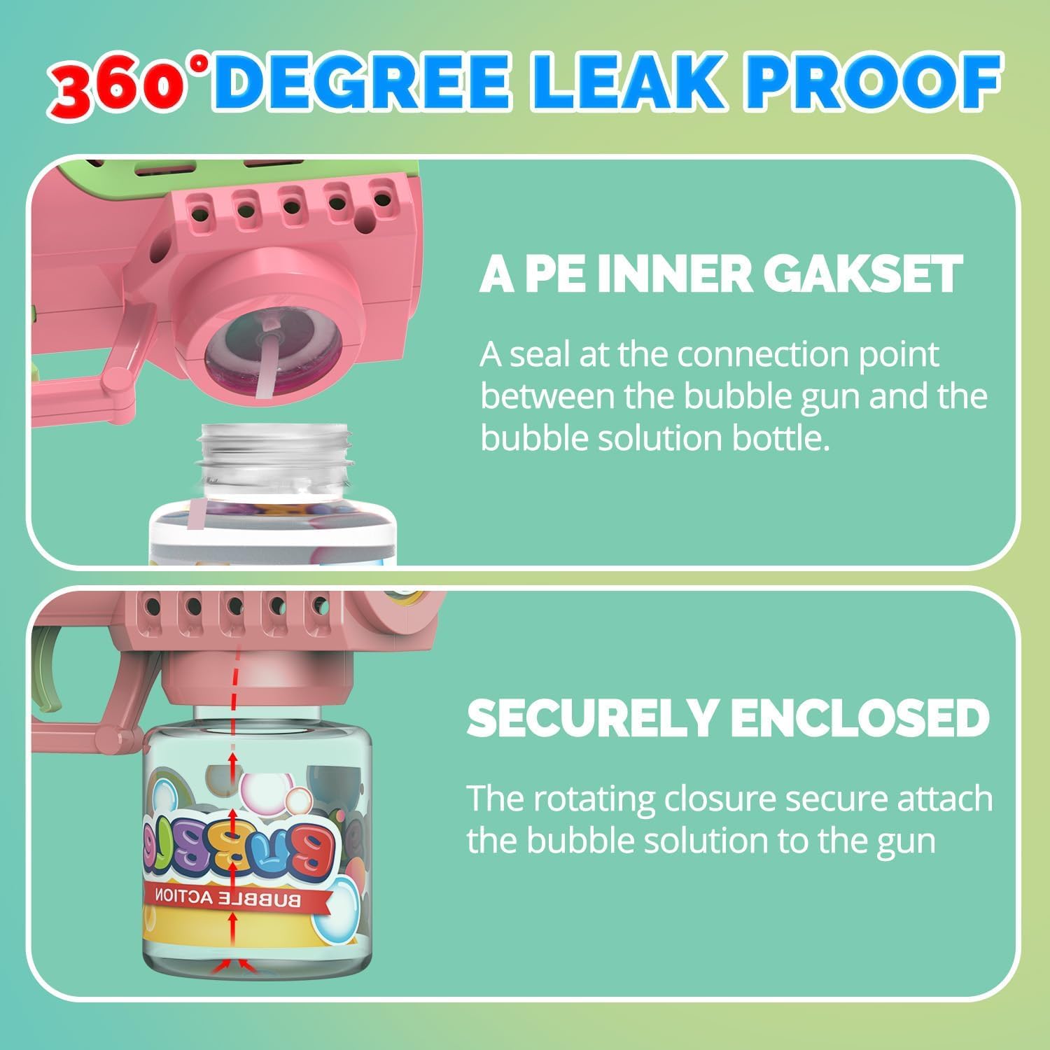 [Leak-Proof & Mess-Free Design] – Featuring a 360° leak-proof system with a PE gasket, these bubble guns can be tilted, flipped, or carried without spills. No sticky mess-just nonstop bubble-blasting fun for toddlers and kids.