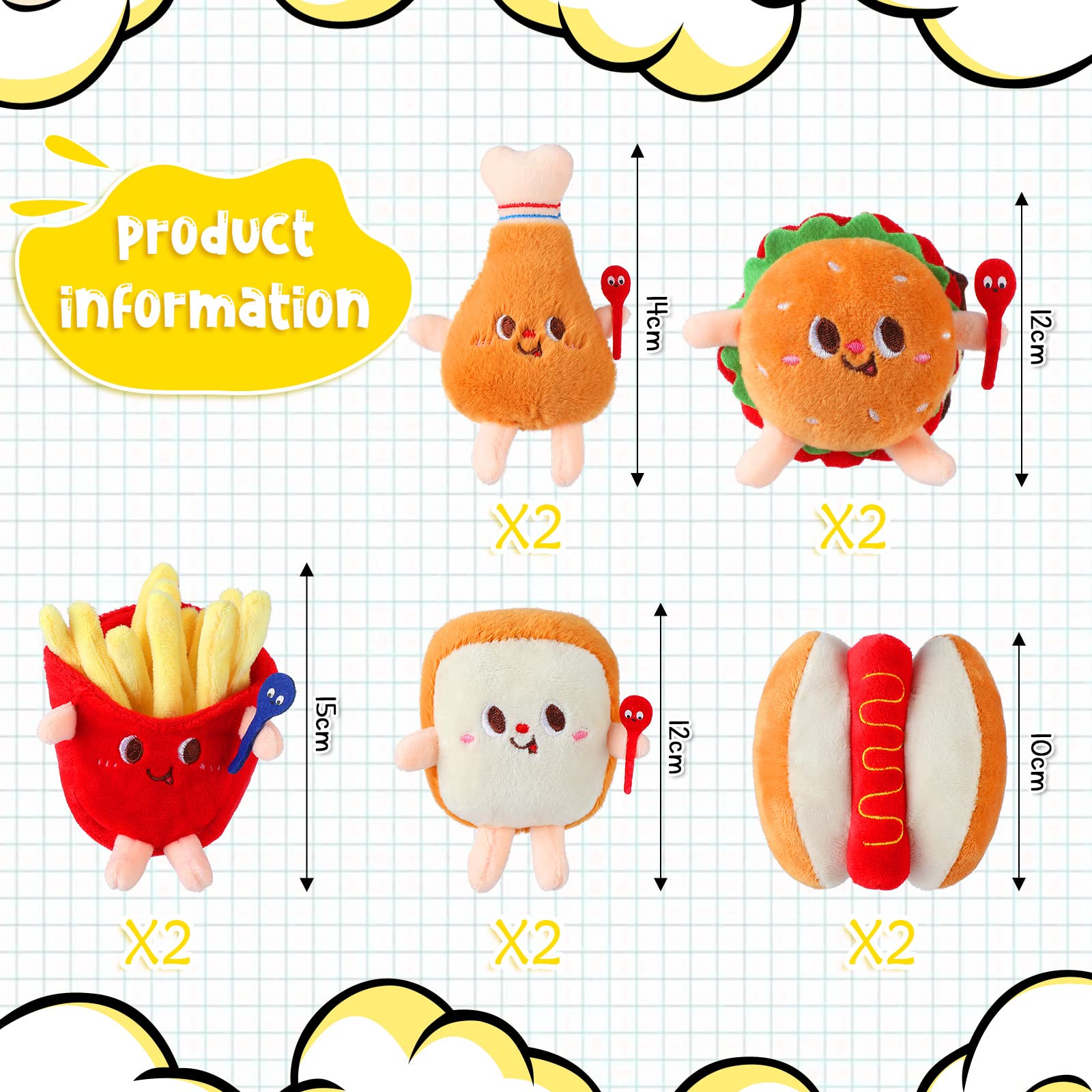 - Food Plush Toy Set: you will get a total of 10 food stuffed plush toys in 5 cute designs, including hamburgers, hot dogs, french fries, drumsticks, and bread, 2 of each style, they are cute, realistic, and brightly colored, which can easily to attract people’s attention, especially children