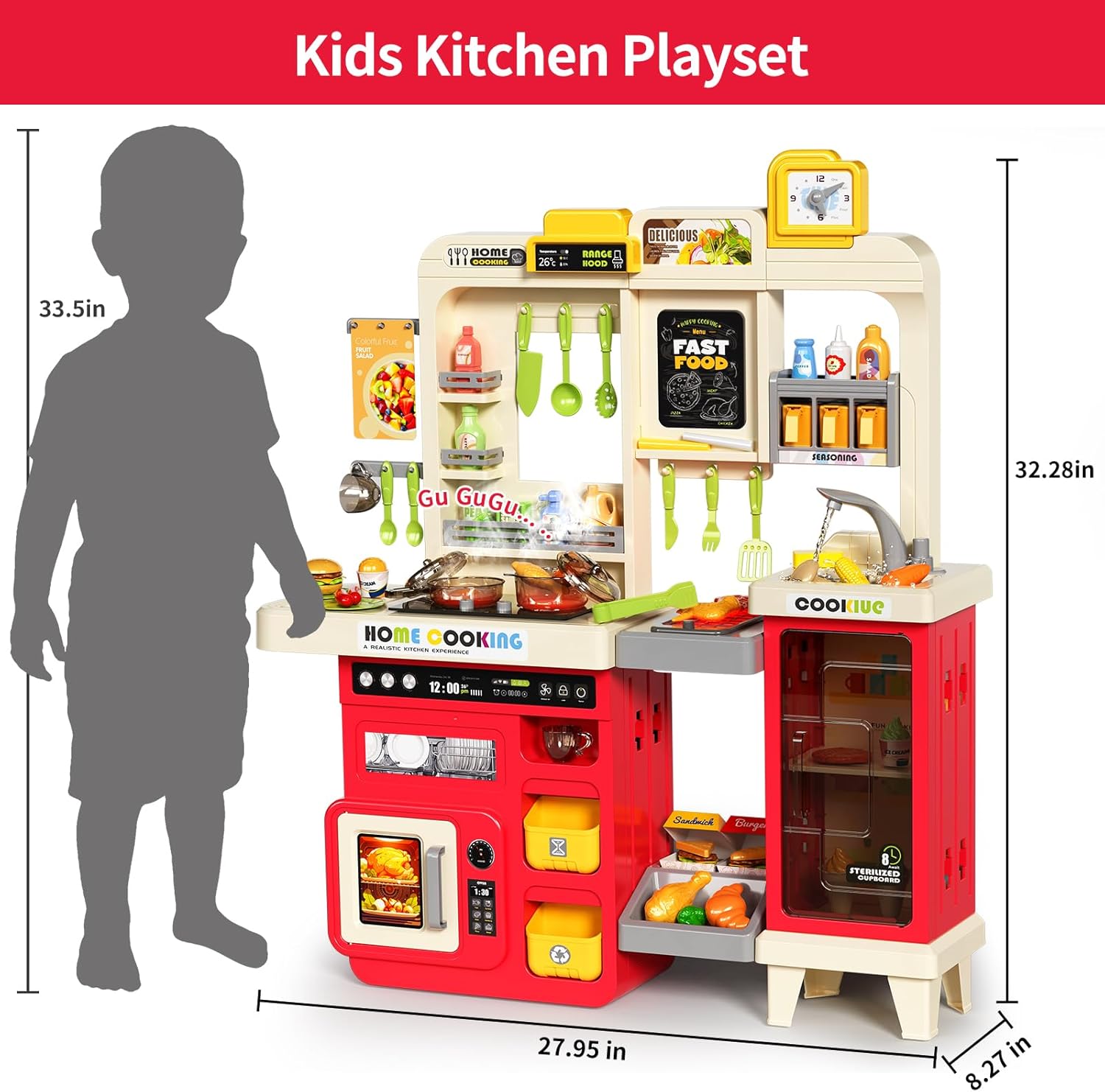 - 3-in-1Kids Toy Kitchen Sets: This kitchen play set puts your little chefs one totally in control of their own pretend-play set up. Cooking, barbecue and play sink in one large play kitchen set. It is suitable for multiple kids to play together and allows them to stir-fry, roast meat and wash vegetables simultaneously. Play kitchen dimensions: 32.28*8.27*27.95in(Assembly required).