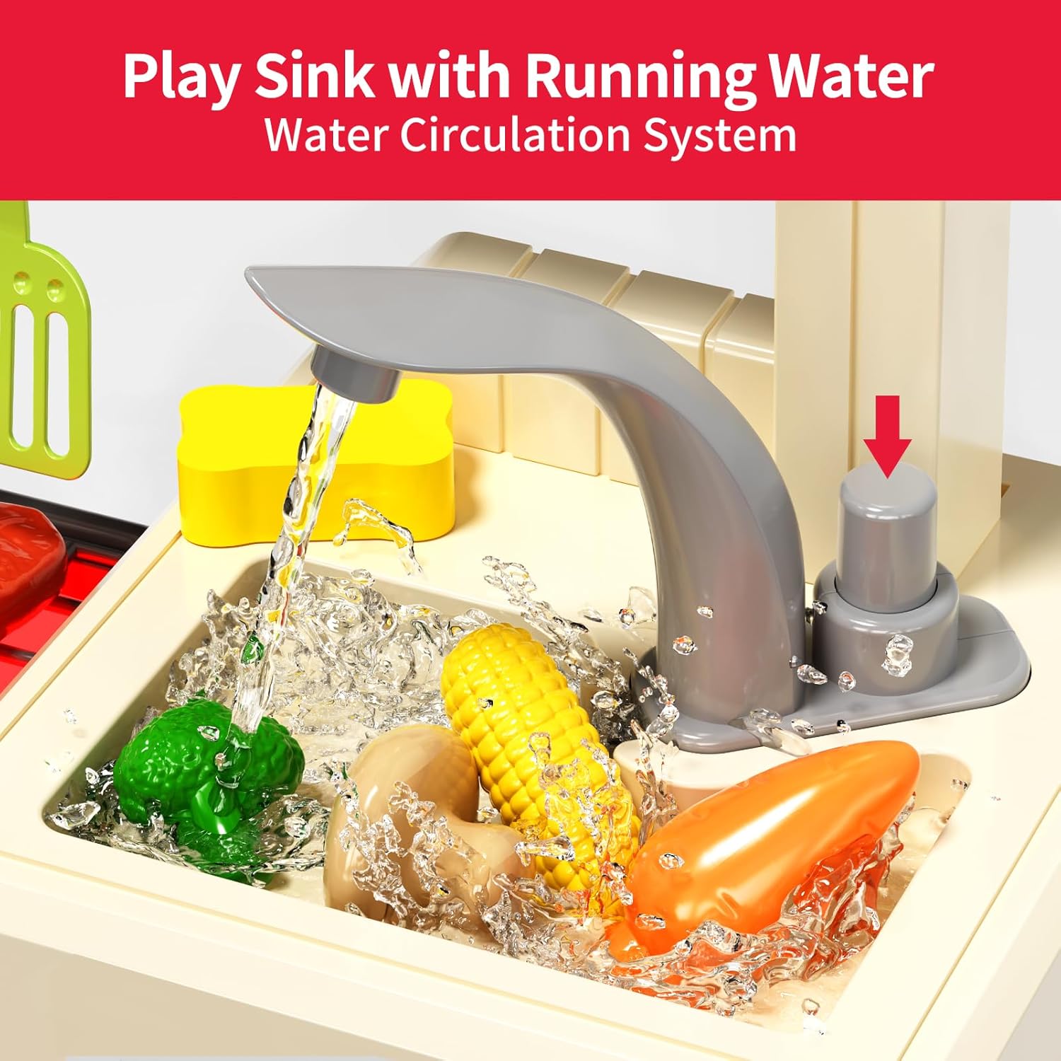 Play Sink with Running Water: The play kitchen sink with water circulation system, press the button behind the faucet, the water will come out, children can wash vegetables, fruits, pots and pans in the sink. Cultivate children’s organized living habits and environmental awareness.