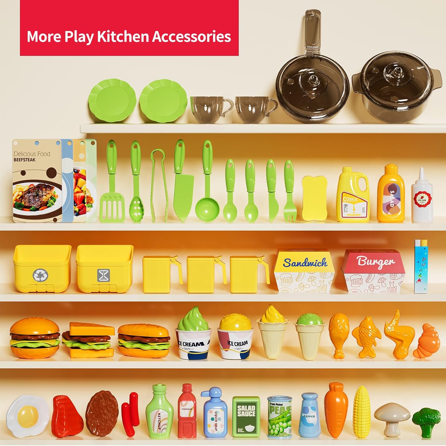 80PCS+ Play Kitchen Accessories: The toy kitchen sets includes Various toy foods, pot, pan, lid, plates, cups, tableware, squeeze bottles, seasoning box, kitchen utensils, menu, etc. that kids can test practical skills and immerse themselves in a world of creative, self-directed play.