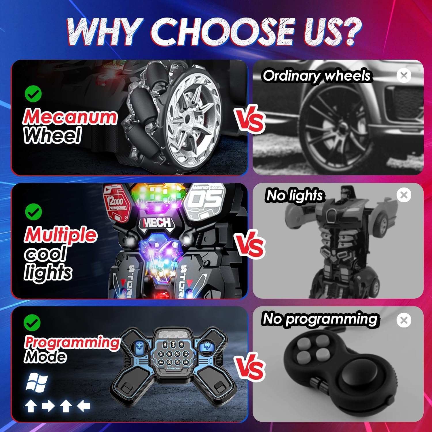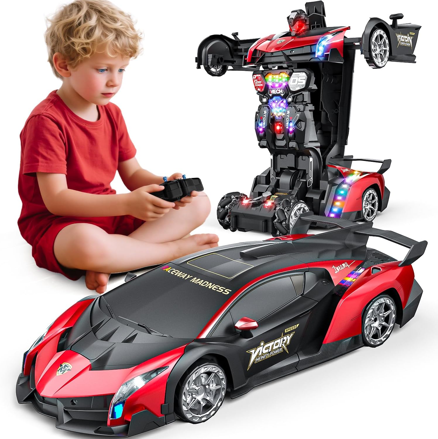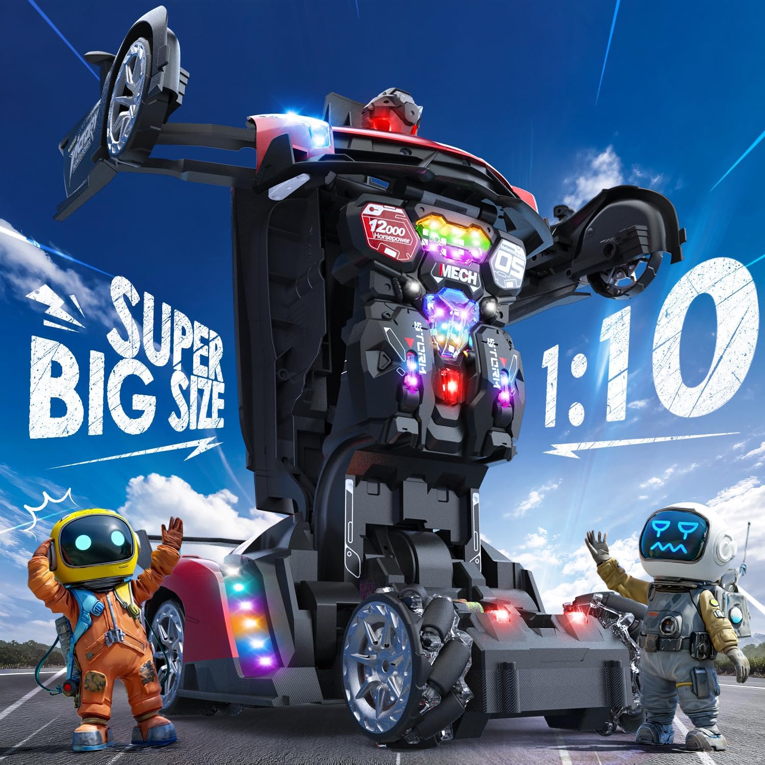 - The Ultimate Gift :Large 1:10 Scale & Dazzling Effects: A perfect surprise for any occasion! This large 1:10 scale transforming RC car isn’t just a toy—it’s an experience. With vibrant LED lights, a cool fog effect, and one-touch transformation, it delivers the high-tech excitement boys and girls crave for birthdays and holidays.