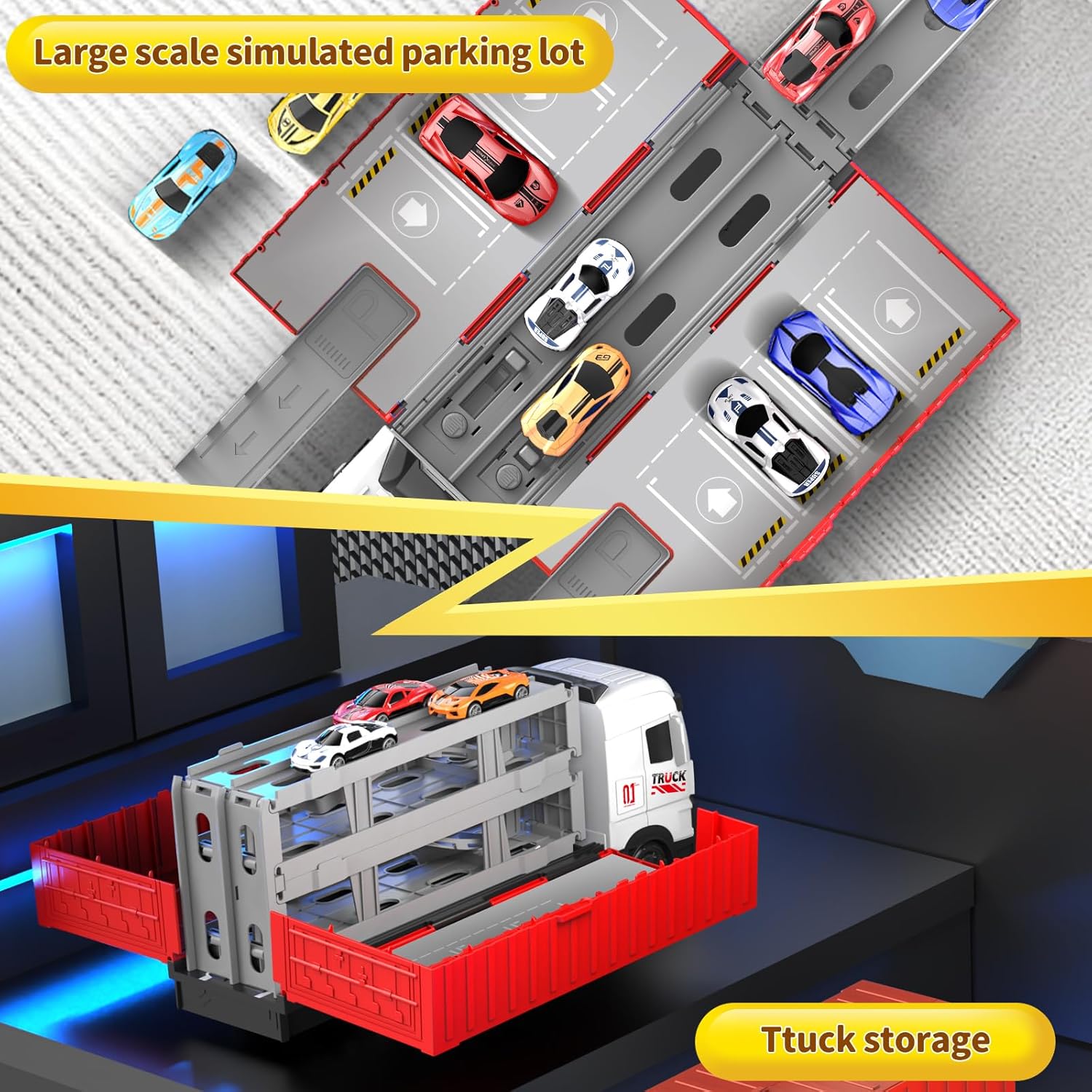 * 【Space-Saving Storage Solution】Close the truck to neatly store all collapsible tracks and 8 race cars with secure hidden clasps, providing a tidy storage solution for portability and mess-free pla