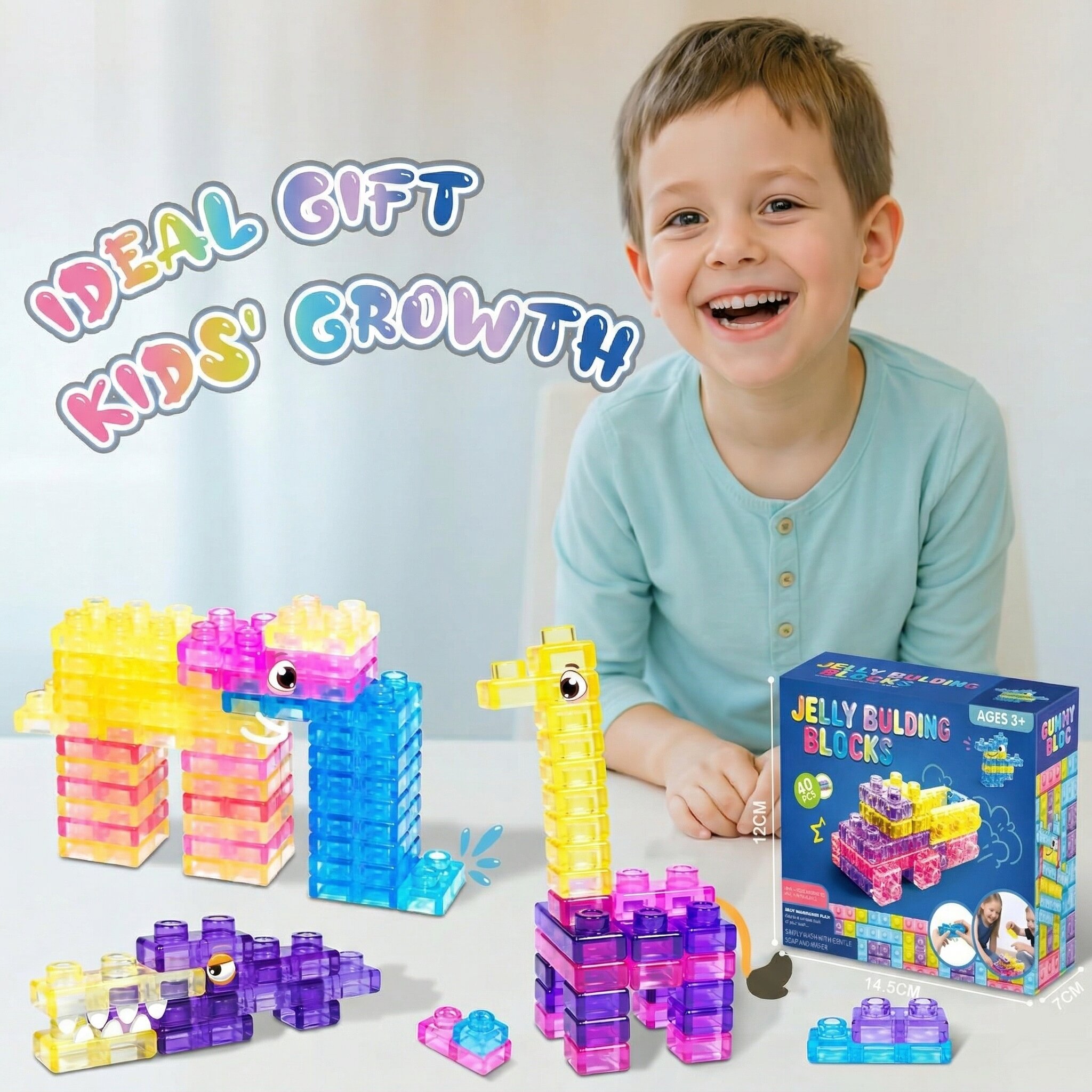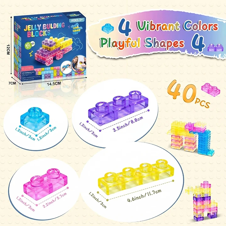 [Bright Colors & Sensory Fun]Includes 40 chunky blocks in four vibrant shades-blue, yellow, pink, and purple-that instantly capture attention. The soft, elastic texture provides a rich sensory experience, encouraging toddlers to squeeze, grip, and stack while boosting creativity and color recognition