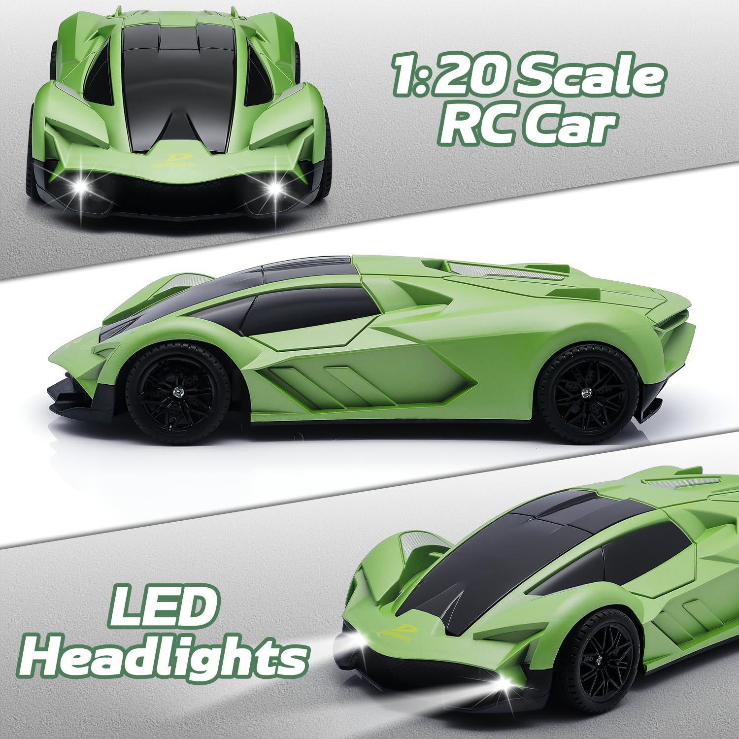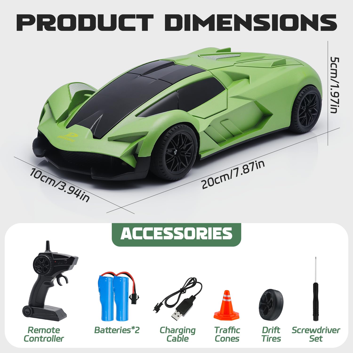 RC Drift Car: This 1:20 scale RC car, featuring an exciting drift function, enables it to perform smooth drifts and high-speed cornering with ease on flat surfaces.2.4Ghz remote provides a stable and wider control range for the game.